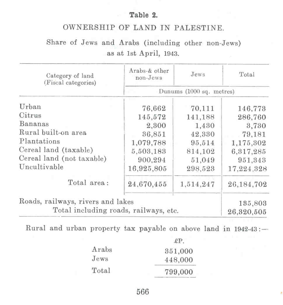 It should be noted the the below table was directly scanned from Survey of Palestine (p. 566) which was prepared by the British Mandate for the United Nations. Note that soon after the 1948 war, the "Jewish state" controlled an area of 20,660,000 dunums.