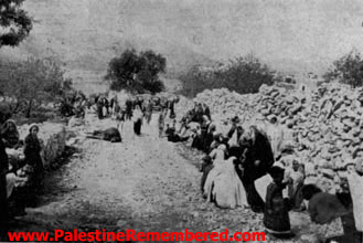 [Near Sa'sa' northwest of Safad,] I saw suddenly by the roadside a tall man, bent over, scarping with his fingernails in the hard, rocky soil. I stopped. I saw a small hollow in the ground, dug out by hand, with fingernails, under an olive tree. The man laid down the body of a baby who had died in the arms of his mother, and covered it with soil and small stones." Near Tarshiha [northeast of Acre], Carmel saw a 16-year-old youth "sitting by the roadside, naked as the day he was born and smiling at our passing car." Carmel described how some of the Israeli soldiers, regarding the [Palestinian] refugee columns with astonishment and shock and "with great sadness," went down into the wadis and gave the [Palestinian] refugees bread and tea. " I knew [of] a unit in which no soldier ate anything that day because all [the food] sent it by the company kitchen was taken down to the wadi." (Benny Morris, p. 231-2)