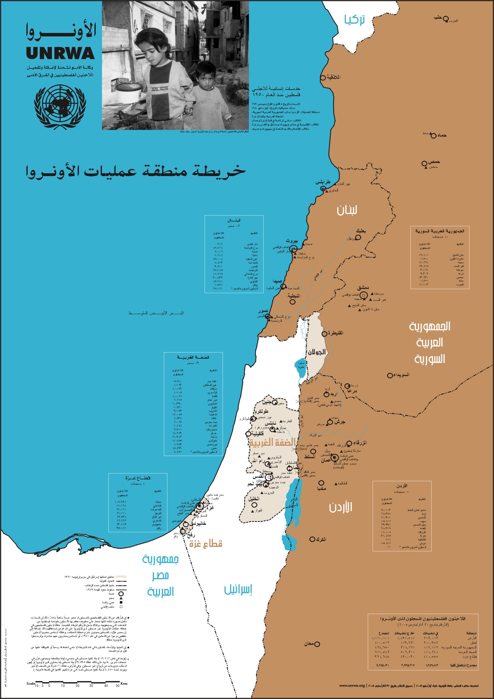 خرائط لفلسطين: خارطة للأونروا تبيين مخيمات اللجوء المعترف بها في الشرق الأوسط |