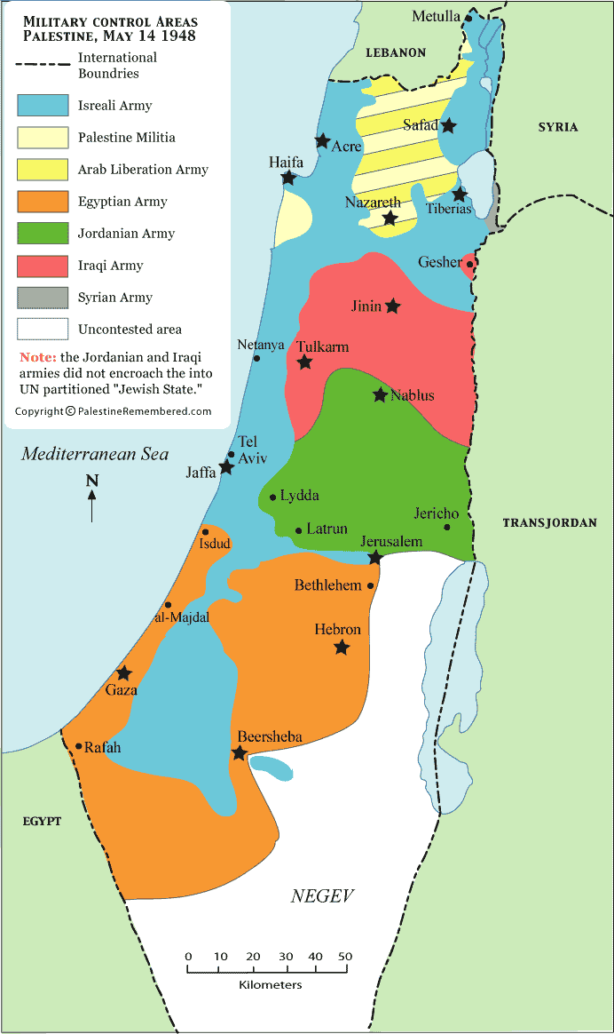 The strongest Arab armies, Jordanian and Iraqi, didn't even attempt to encroach on the areas allotted to the "Jewish state" by the 1947 U.N. Partition plan.