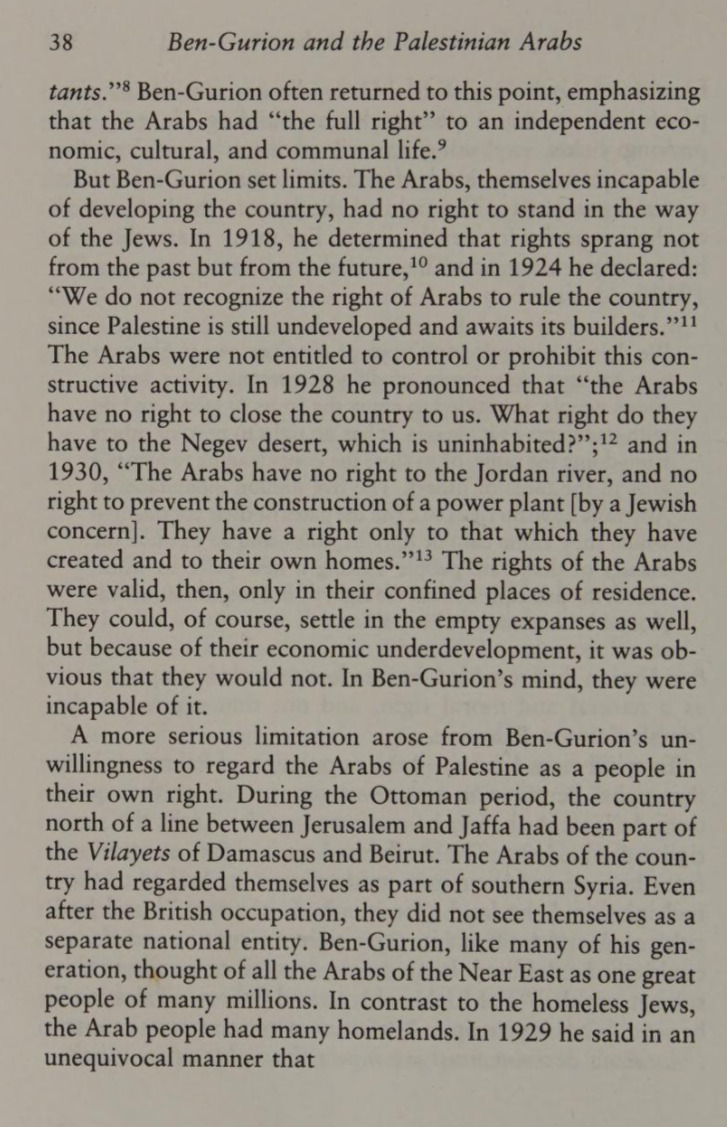 But Ben-Gurion set limits. The Palestinian people were incapable (by themselves) of developing Palestine, and they had no right to stand in the way of the Jews. He argued in 1918 that Jews' rights sprang not only from the past but also from the future. In 1924, he declared: