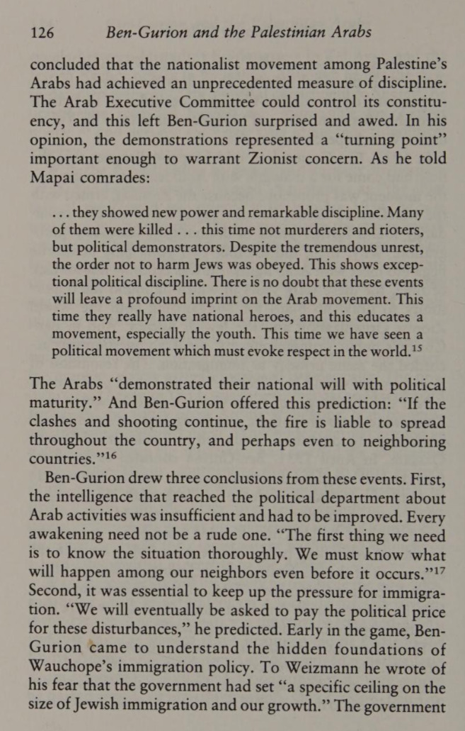 ". . . they [referring to Palestinians] showed new power and remarkable discipline. Many of them were killed . . . this time not murderers and rioters, but political demonstrators. Despite the tremendous unrest, the order not to harm Jews was obeyed. This shows exceptional political discipline. There is no doubt that these events will leave a profound imprint on the [Palestinian] Arab movement. This time, we have seen a political movement that must evoke the respect of the world. (Shabtai Teveth, p. 126)