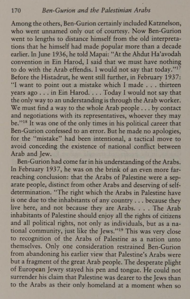 In February 1937, Ben-Gurion was on the brink of a far-reaching conclusion that the Arabs of Palestine were a separate people, distinct from other Arabs and deserving of self-determination. He stated:
