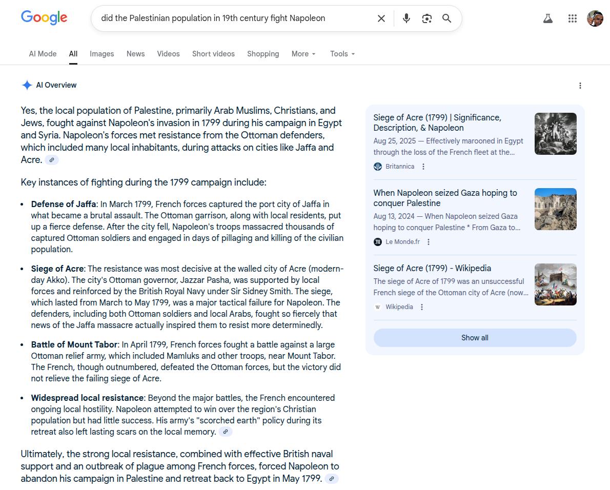 - Let us pretend that Napoleon (Europe's greatest general) wasn't defeated in Palestine in 1799, and the Palestinians' war of attrition played no factor in this defeat. Let us also pretend that the Egyptian occupation of Palestine didn't suffer a similar fate three decades later. Here is what ChatGPT had to say about this point.