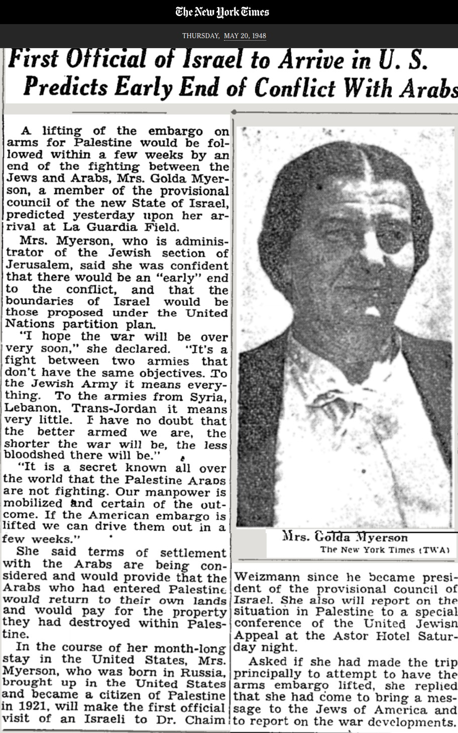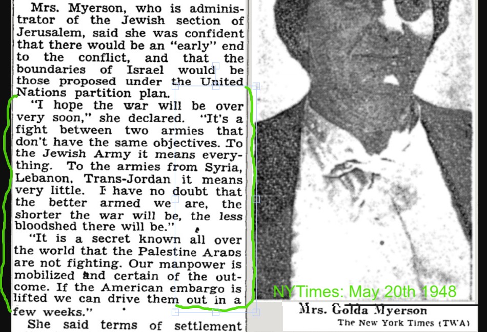 NYTimes Quoting Golda Myerson on May 20th, 1948, saying Arabs are weak & disorganized and could be easily defeated