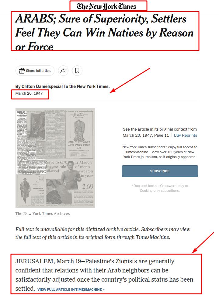 NY Times, March 20th, 1947: ARABS; Sure of Superiority, Settlers Feel They Can Win Natives by Reason or Force