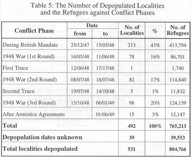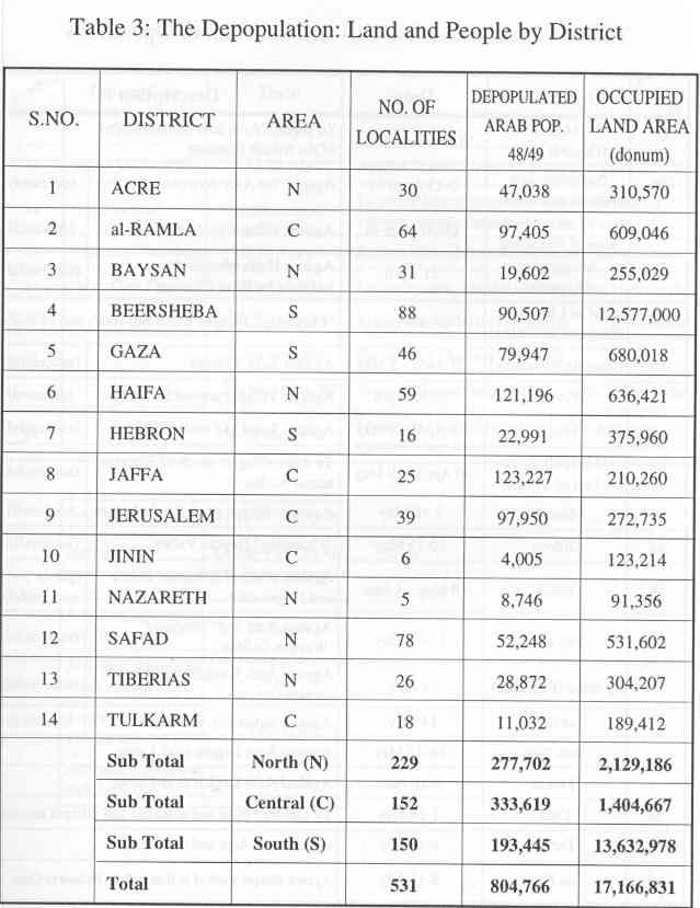 Table 3 summarizes the ethnic cleansing figures by District. The largest ethnic cleansing occurred in districts of Jaffa, Haifa, and Jerusalem, which had a high Jewish concentration. The highest number of ethnically cleansed localities is in predominantly Arab areas: Beer Sheba, al-Ramla and Safad. The largest land occupied is in Beer Sheba, followed by Gaza, Haifa, al-Ramla and Safad. The largest percentage of the refugees cam from