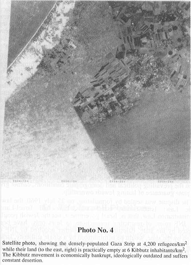 The Palestinians dispossession cannot be realistically tolerated or continue to be ignored with any degree of realism. As the satellite photo (photo 4) shows, Gaza Strip is packed with refugees (2500 persons/km2, or 4,200 persons/km2, if net area is used) while the refugees see, across the barbed wire, their land to the east, in which only 6 persons/km2 live. This striking contrast in demography is the root cause of the conflict (see photo 4).