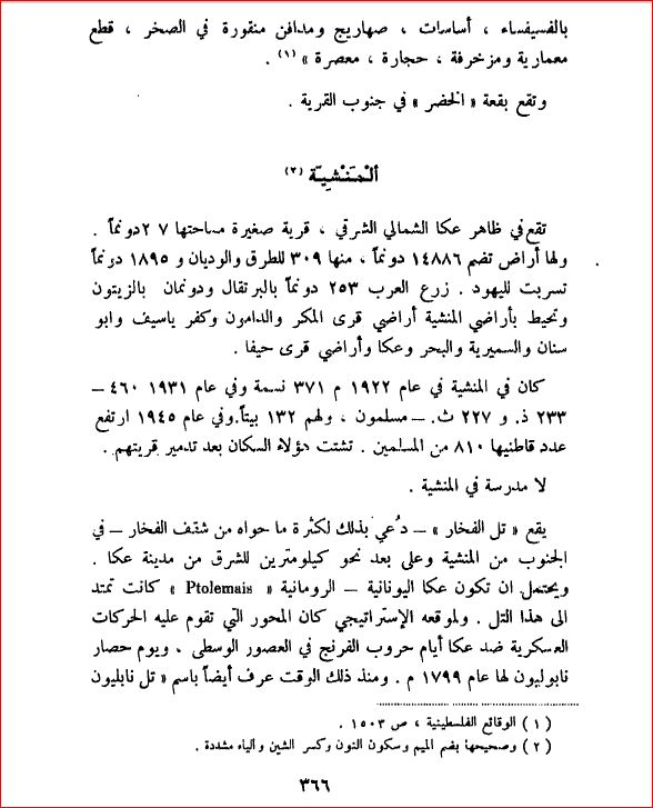 القرية قبل النكبة (كي لا ننسى للدكتور وليد الخالدي)كانت القرية مبنية على مرتفع من الحجر الرملي في الجزء الشمالي الغربي من سهل عكا وعلى بعد 3كلم إلى الشمال من نهر النعامين وكان ثمة إلى الغرب منها, على بعد نصف كيلومتر, قناة الباشا التي كانت تجلب المياه من ينابيع الكابري إلى عكا. وكانت طريق فرعية قصيرة تربط المنشية بالطريق العام الساحلي المؤدي إلى عكا. وبسبب قربها من عكا, أتيح لسكانها الاستفادة من نظام المواصلات وغيره من الخدمات في المدينة. وكان سكان القرية يرون أن المنشية ظهرت إلى الوجود عقب الحروب الصليبية وأن المماليك استقدموا سكانها الأصلين من شمال لإفريقيا بغية إسكانهم في المنطقة التي تضاءل عدد سكانها كثيراً بسبب الحروب الصليبية والأوبئة وإن كان صحيحا فلا ريب أن القرية تلاشت لاحقا لأنها ليست واردة في جملة القرى التي تذكر السجلات أنها كانت تدفع الضرائب في سنة 1596 وفي نهاية القرن التاسع عشر, كانت المنشية آهلة مرة أخرى وكانت القرية تقع في سهل وتحيط بها الأراضي الزراعية وكانت منازلها مبنية بالحجارة والطين وعدد سكانها 150 نسمة تقريبا. عند بداية القرن الحالي كان للقرية شكل مربع وكانت منازلها المبنية بالحجارة والأسمنت والطين متجاورة وكان سكانها جميعهم من المسلمين وكان فيها مقام بهاء الله مؤسس البهائية وهي ديانة ظهرت في بلاد فارس في القرن التاسع عشر. كان بهاء الله سجن في عكا على يد العثمانيين وذلك بطلب من الحكومة الفارسية وتوفي في المدينة سنة 1892 وكان في القرية أيضا ميتم إسلامي ومسجد يدعى مسجد أبو عطية أما اقتصادها فكان يعتمد على الزراعة ولا سيما الحبوب وتربية المواشي. في 1944/1945 وكان ما مجموعه 253 دونما مخصصا للحمضيات والموز 10818 دونما للحبوب و619 دونما مرويا أو مستخدما للبساتين وقد أدت الحفريات الأثرية في القرية في 1955-1956 إلى العثور على خمسة قبور يعود تاريخ أقدمها إلى القرن الثالث الميلادي. ويقع تل الفخار على بعد نحو كيلومتر إلى الجنوب حيث عثر على الأسس القديمة لمدينة عكا في حفريات بدأت سنة 1973. كان هناك مجموعة صغيرة من المزارعين تعيش على سفح التل في أواسط الألف الرابع قبل الميلاد. وبحلول القرن السادس قبل الميلاد كانت هذه القرية قد توسعت غربا في تجاه الشاطئ وكان التل هذا هو موقع عكا في العهدين اليوناني والروماني وبالإضافة إلى القطع الفخارية, كان التل يضم بقايا مقابر. إحتلال القرية وتطهيرها عرقيازجت المنشية في الحرب أول مرة جراء تسلل إسرائيلي وقع في 6 شباط / فبراير 1948 ففي ذلك اليوم وفق ما ذكرت صحيفة (فلسطين) شن عدد من اليهود المسلحين بالأسحلة الأتوماتيكية ورشاشات (ستن) هجوما على القرية. وجاء في الصحيفة أن سكان القرية صدوا ذلك الهجوم ولم تذكر وقوع إصابات وعلى الرغم من عدم توفر أية تفصيلات محددة فإن الدلائل تشير إلى أن هذه القرية كانت بين القرى التي سقطت في أثناء عملية بن عمي(أنظر الغابسية, قضاء عكا), في 14 أيار\ مايو 1948 وبعد احتلالها بشهر واحد في 16 حزيران \ يونيو, كان في استطاعة رئيس الحكومة بن- غوريون أن يذكر في تقاريره أن تدمير المنشية بدأ فعلا. القرية اليوملا يزال المقام البهائي والمسجد ومدرسة الأيتام الإسلامية وبعض المنازل القليلة قائمة. أما ما تبقى من القرية فقد أندثر والمقام بناء جميل له قبة وتحيط بحائطه الأمامي ومدخله المقوس أعمدة حجرية كبيرة وثمة قبور عدة في فناء قريب. والمقام والقبور تحظى بعناية جيدة ويزورها البهائيون من أرجاء العالم كافة. أما المسجد هو بناء حجري له قبة وسقوف بيضوية الشكل فقد أصبح منزلا تسكنه عائلة يهودية. كما أن مدرسة الأيتام الإسلامية آهلة هي أخرى ولا تزال المقبرة ظاهرة للعيان غير أنها مهملة وفيها شاهد عليه كتابة بالتركية تعود إلى القرن الثامن عشر أما قناة الباشا المبنية بالحجارة فلا تزال قائمة غير أنها ليست في قيد الاستعمال ومثلها قناة جر المياه. المغتصبات الصهيونية على اراضي القريةفي سنة 1948 أنشئت مستعمرة شمرات (159261) وبستان هغليل (158261)على أرضي ال