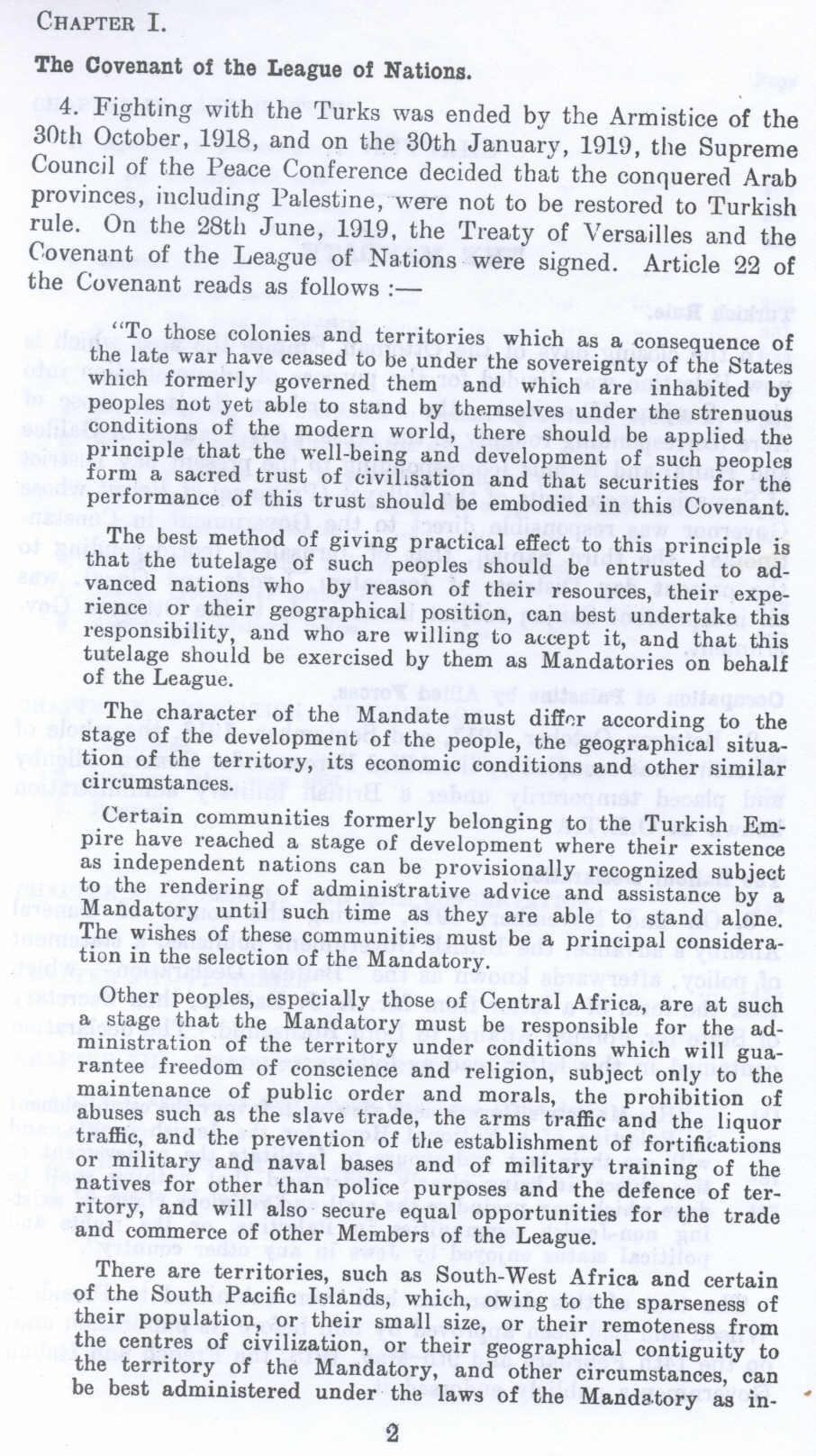 The Covenant of the League of Nations on Palestine. British Mandate: A Survey of Palestine, The Mandate: : Volume I - Page 2 |