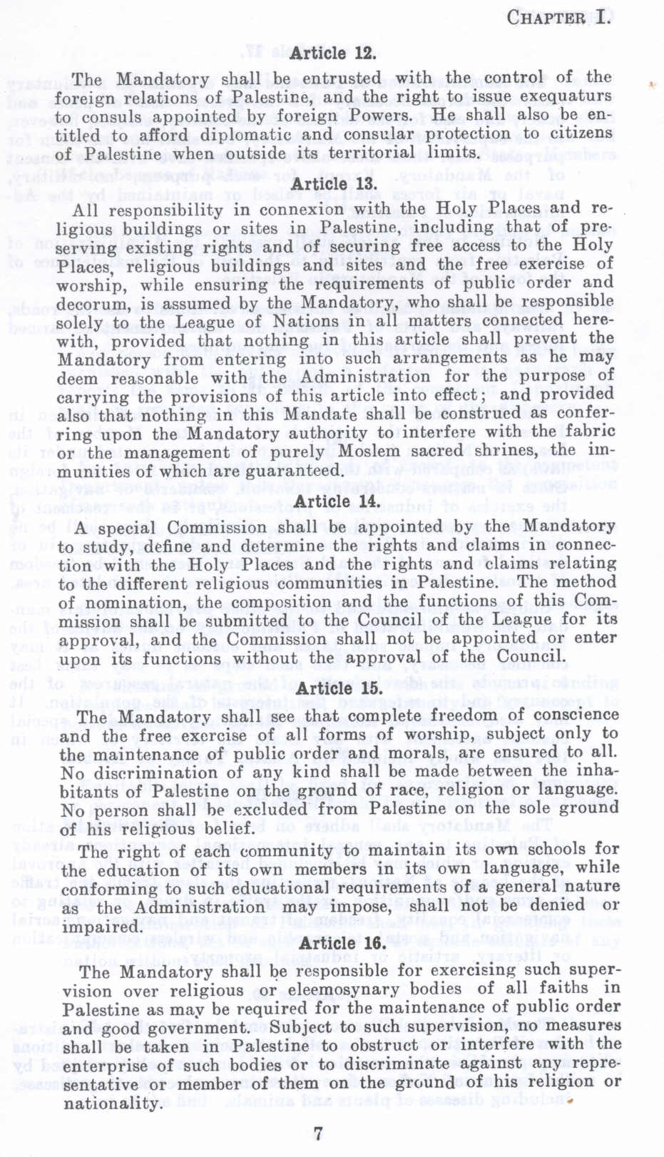 A special Commission shall be appointed by the Mandatory to study, define and determine the rights and claims in connection with the Holy Places and the rights and claims relating to the different religious communities in Palestine. The method of nomination, the composition and the functions of this Commission shall be submitted to the Council of the League for its approval, and the Commission shall not be appointed or enter upon its functions without the approval of the Council.