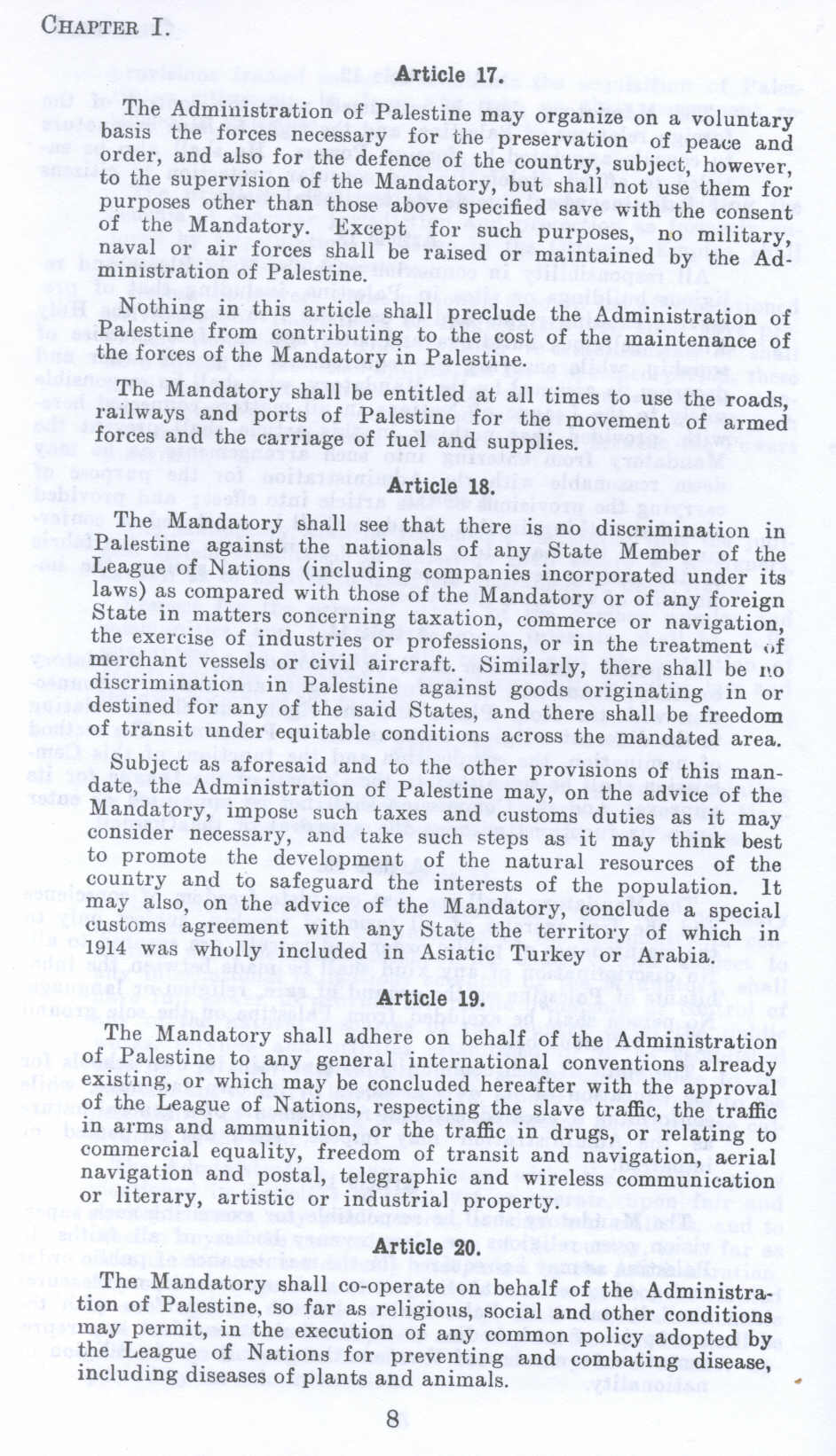 The Mandatory shall see that there is no discrimination in Palestine against the nationals of any State Member of the League of Nations (including companies incorporated under its laws) as compared with those of the Mandatory or of any foreign State in matters concerning taxation, commerce or navigation, the exercise of industries or professions, or in the treatment of merchant vessels or civil aircraft. Similarly, there shall be no discrimination in Palestine against goods originating in or destined for any of the said States, and there shall be freedom of transit under equitable conditions across the mandated area.