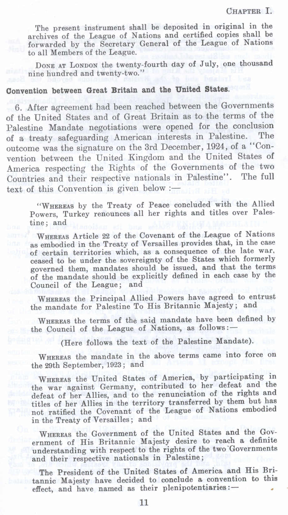 Convention between Great Britain and the United States on Palestine. British Mandate: A Survey of Palestine: The Mandate Volume I - Page 11 |