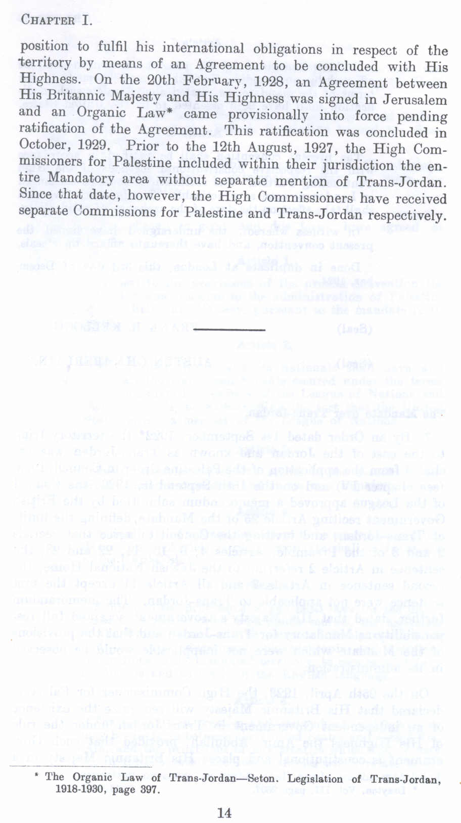 position to fulfil his international obligations in respect of the territory by means of an Agreement to be concluded with His Highness. On the 20th February, 1928, an Agreement between His Britannic Majesty and His Highness was signed in Jerusalem and an Organic Law* came provisionally into force pending ratification of the Agreement. This ratification was concluded in October, 1929. Prior to the 12th August, 1927, the High Commissioners for Palestine included within their jurisdiction the entire Mandatory area without separate mention of Trans-Jordan. Since that date, however, the High Commissioners have received separate Commissions for Palestine and Trans-Jordan respectively.