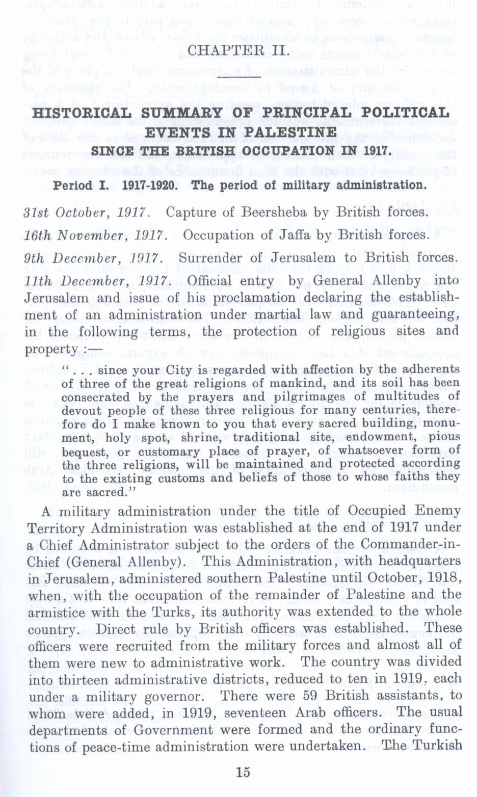 Chapter II: Historical Summary of Principal Events in Palestine. Since The British Occupation in 1917. British Mandate: A Survey of Palestine: Volume I - Page 15 |