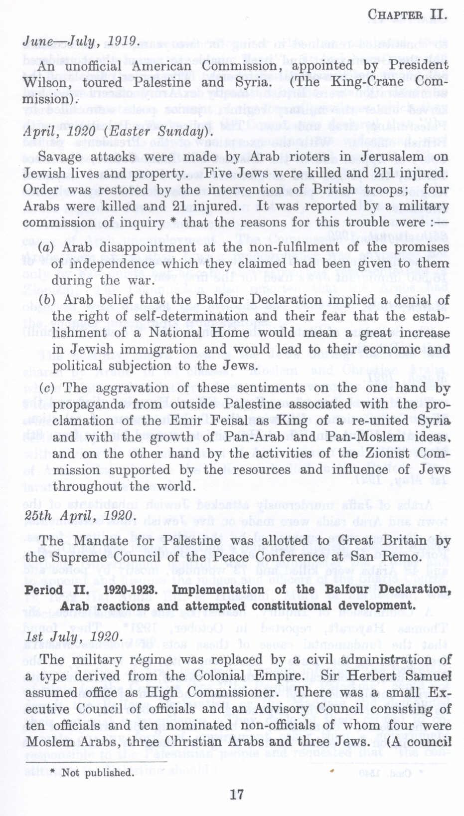 Historical Summary, 1920. Period II: 1920 - 1923 Implementation of the Balfour Declaration, Arab reactions and attempted constitutional development in Palestine. British Mandate: A Survey of Palestine: Volume I, Chapter II - Page 17 |
