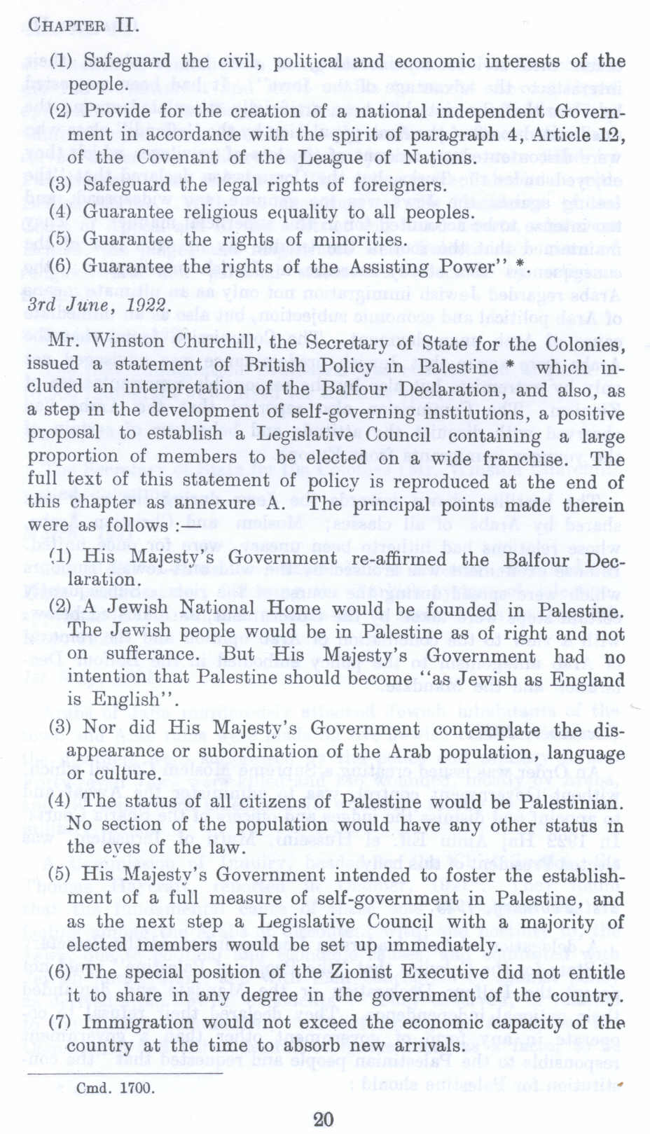 Mr. Winston Churchill, the Secretary of State for the Colonies, issued a statement of British Policy in Palestine • which included an interpretation of the Balfour Declaration, and also, as a step in the development of self-governing institutions, a positive proposal to establish a Legislative Council containing a large proportion of members to be elected on a wide franchise. The full text of this statement of policy is reproduced at the end of this chapter as annexure A. The principal points made therein were as follows :-