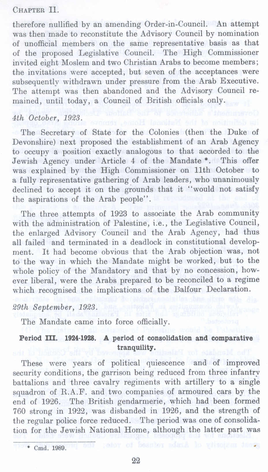British Mandate: A Survey of Palestine: Chapter II, Historical Summary 1923. Period III: A period of consolidation and comparative tranquility, Sept. 1923 Volume I - Page 22 |