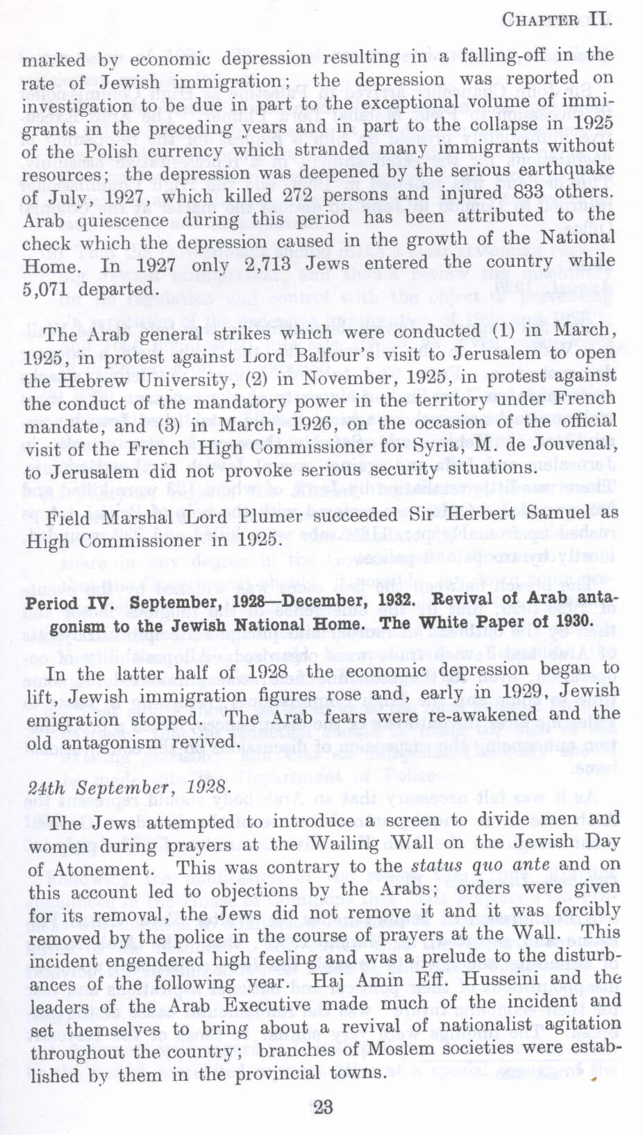 Revival of Arab antagonism to the Jewish National Home. The White paper of 1930 in Palestine. British Mandate: A Survey of Palestine. Volume I - Page 23 |