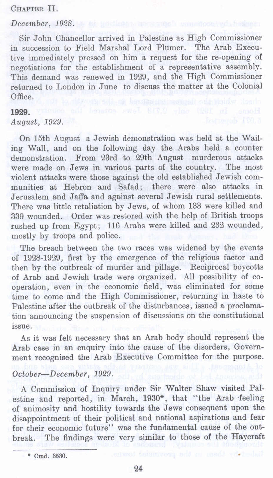 British Mandate: A Survey of Palestine: Historical Summary, 1930, Volume I - Page 24. Revival of Arab antagonism to the Jewish National Home. The White paper of 1930 |
