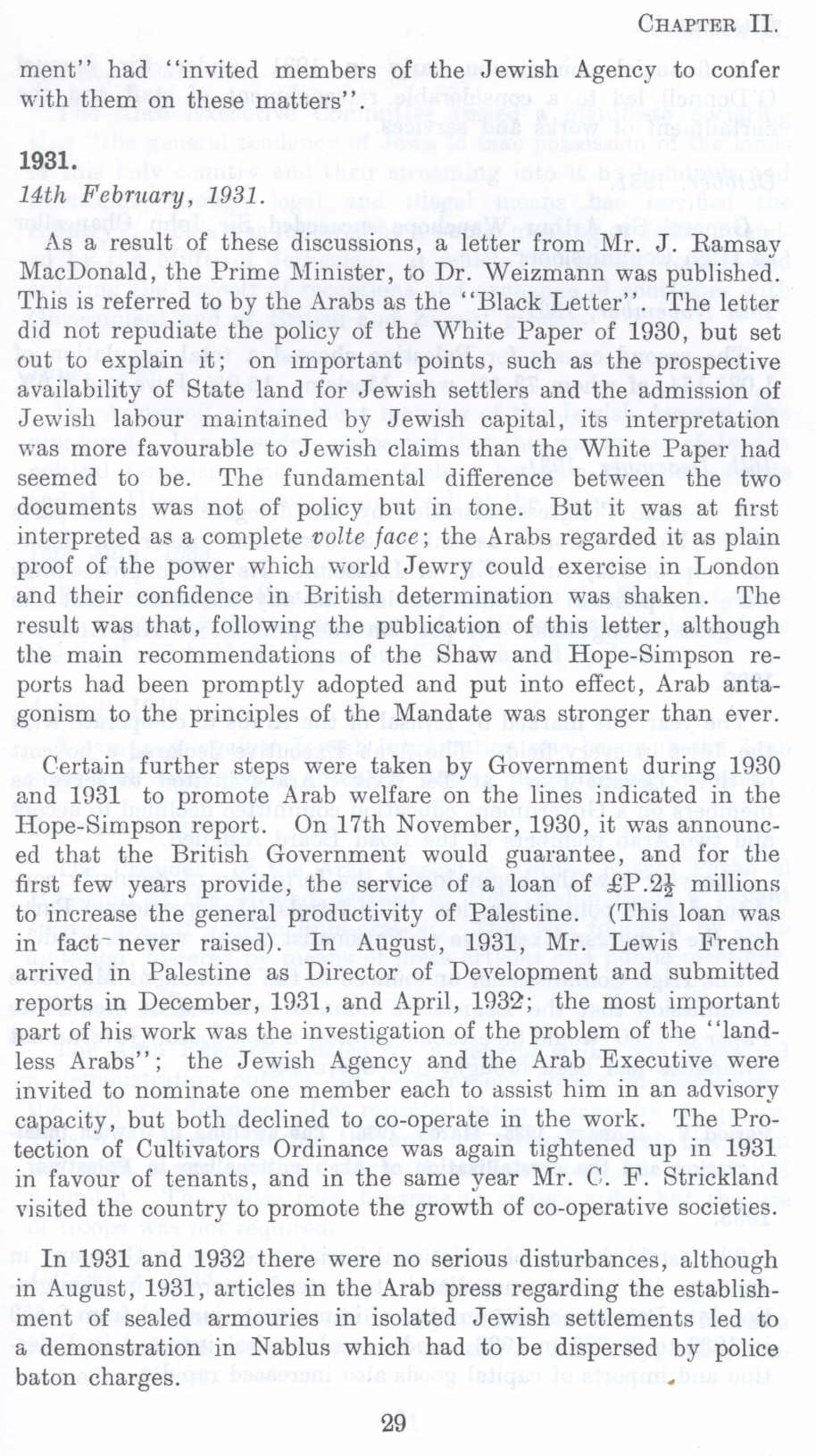 As a result of these discussions, a letter from Mr. J. Ramsay MaoDonald , the Prime Minister, to Dr. Weizmann was published. This is referred to by the Arabs as the ''Black Letter''. The letter did not repudiate the policy of the White Paper of 1930, but set out to explain it; on important points, such as the prospective availability of State land for Jewish settlers and the admission of Jewish labour maintained by Jewish capital, its interpretation was more favourable to Jewish claims than the White Paper had seemed to be. The fundamental difference between the two documents was not of policy but in tone. But it was at first interpreted as a complete volte face; the Arabs regarded it as plain proof of the power which world Jewry could exercise in London and their confidence in British determination was shaken. The result was that, following the publication of this letter, although the main recommendations of the Shaw and Hope-Simpson reports had been promptly adopted and put into effect, Arab antagonism to the principles of the Mandate was stronger than ever.