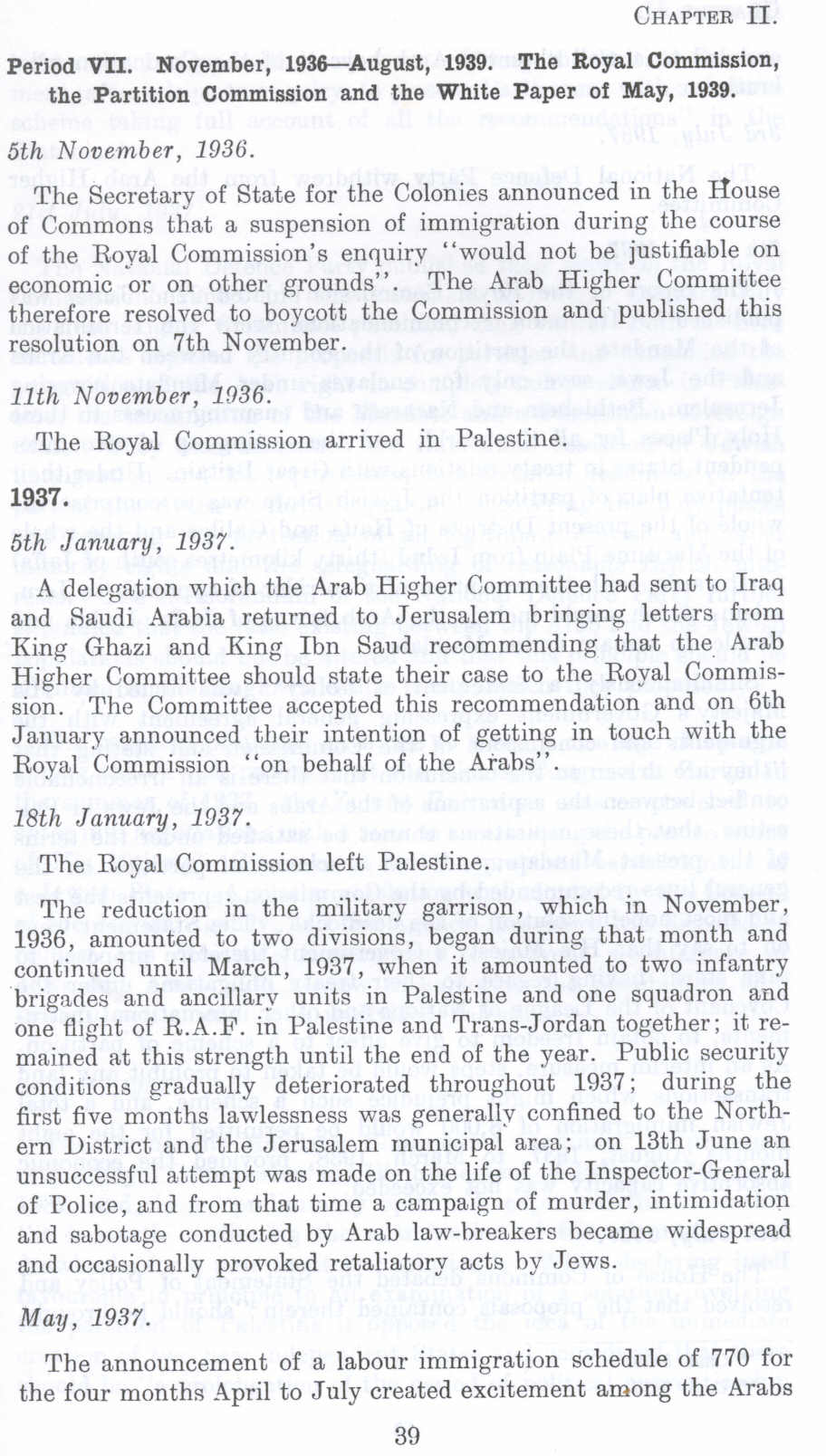 The Royal Commission, the 1939 Partition Commission, and the White Paper of May, 1939 in Palestine. British Mandate: A Survey of Palestine: Volume I - Page 39 |