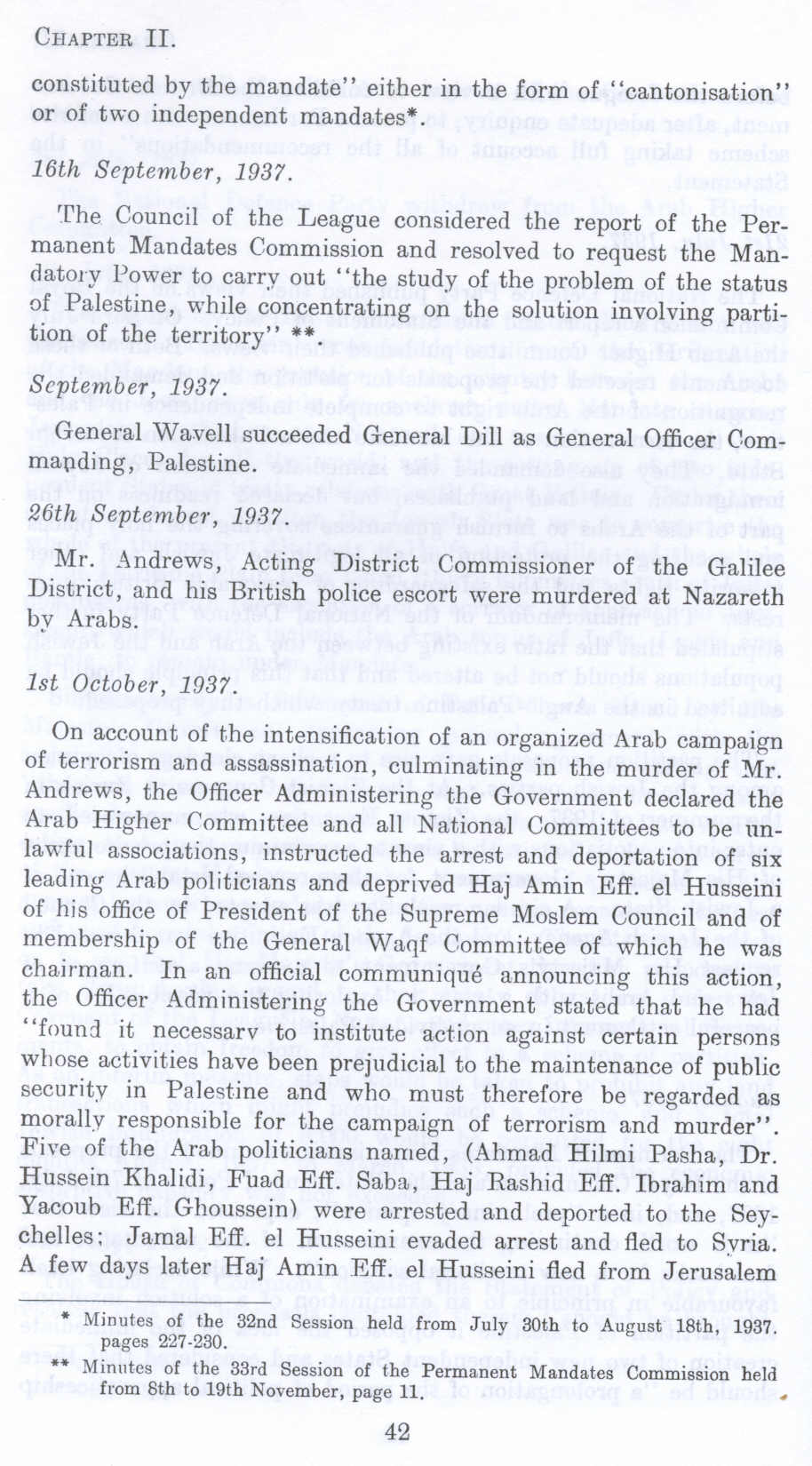 On account of the intensification of an organized Arab campaign of terrorism and assassination, culminating in the murder of Mr. Andrews, the Officer Administering the Government declared the Arab Higher Committee and all National Committees to be unlawful associations, instructed the arrest and deportation of six leading Arab politicians and deprived Haj Amin Eff. el Husseini of his office of President of the Supreme Moslem Council and of membership of the General Waqf Committee of which he was chairman. In an official communiqué announcing this action, the Officer Administering the Government stated that he had "found it necessary to institute action against certain persons whose activities have been prejudicial to the maintenance of public security in Palestine and who must therefore be regarded as morally responsible for the campaign of terrorism and murder''. Five of the Arab politicians named, (Ahmad Hilmi Pasha, Dr. Hussein Khalidi, Fuad Eff. Saba, Raj Rashid Eff. Ibrahim and Yacoub Eff. Ghousseinl were arrested and deported to the Seychelles; Jamal Eff. el Husseini evaded arrest and fled to Svria. A few days later Haj Amin Eff. el Husseini fled from Jerusalem