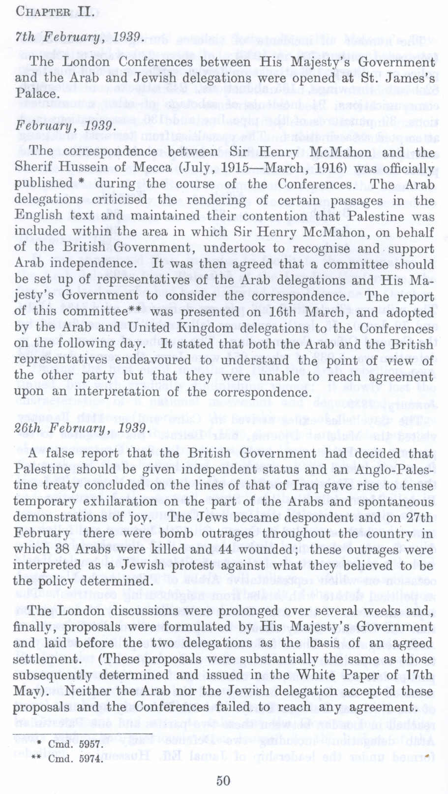 The correspondence between Sir Henry McMahon and the Sherif Hussein of Mecca (July, 1915-March, l916) was officially published * during the course of the Conferences. The Arab delegations criticised the rendering of certain passages in the English text and maintained their contention that Palestine was included within the area in which Sir Henry McMahon, on behalf of the British Government, undertook to recognise and support Arab independence. It was then agreed that. a committee should be set up of representatives of the Arab delegations and His Majesty's Government to consider the correspondence. The report of this committee** was presented on 16th March, and adopted by the Arab and United Kingdom delegations to the Conferences on the following day. It stated that both the Arab and the British representatives endeavoured to understand the point of view of the other party but that they were unable to reach agreement upon an interpretation of the correspondence.