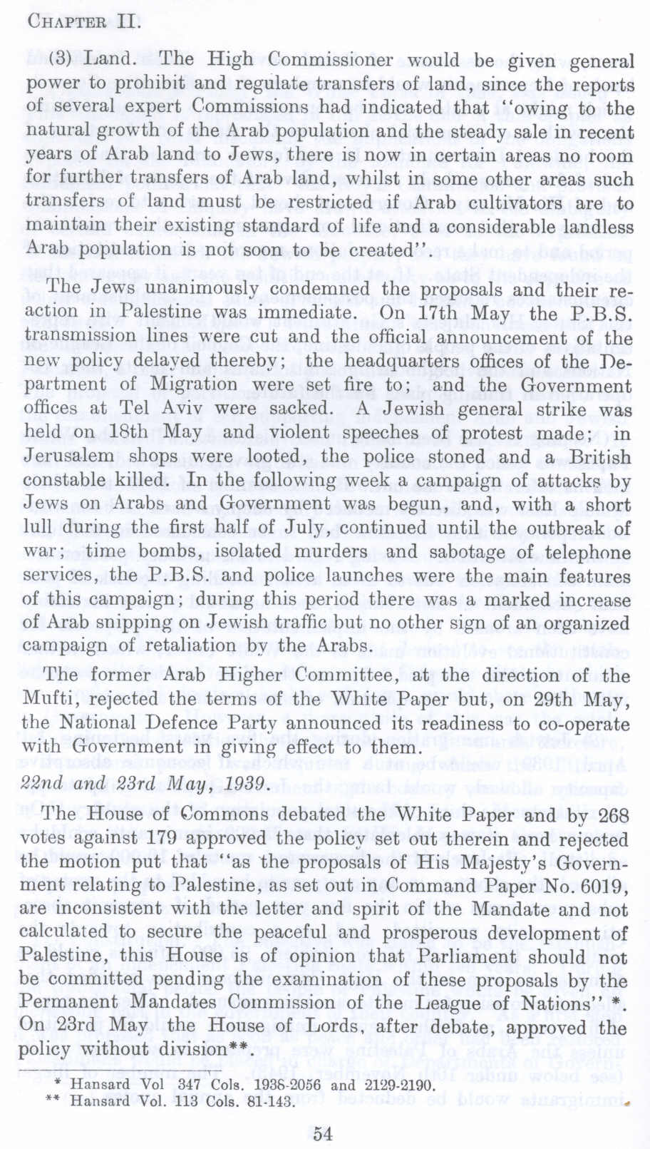 The House of Commons debated the White Paper and by 268 votes against 179 approved the policy set out therein and rejected the motion put that "as the proposals of His Majesty's Government relating to Palestine, as set out in Command Paper No. 6019, are inconsistent with the letter and spirit of the Mandate and not calculated to secure the peaceful and prosperous development of Palestine, this House is of opinion that Parliament should not be committed pending the examination of these proposals by the Permanent Mandates Commission of the League of Nations" *. On 23rd May the House of Lords, after debate, approved the policy without division**.