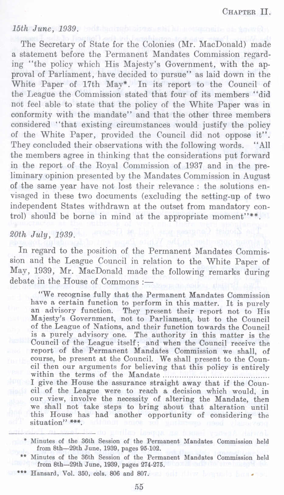 In regard to the position of the Permanent Mandates Commission and the League Council in relation to the White Paper of May, 1939, Mr. MacDonald made the following remarks during debate in the House of Commons :-