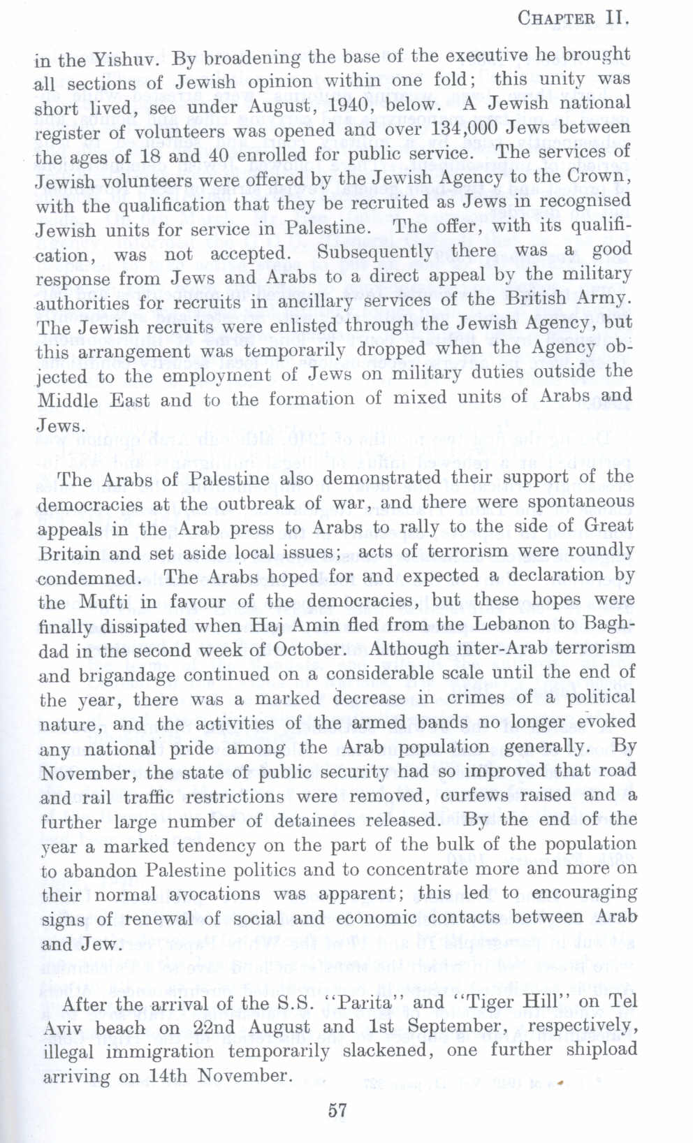 in the Yishnv. By broadening the base of the executive he brought all sections of Jewish opinion within one fold; this unity was short Jived, see under August, 1940, below. A Jewish national register of volunteers was opened and over 134,000 Jews between the ages of 18 and 40 enrolled for public service. The services of Jewish volunteers were offered by the Jewish Agency to the Crown, with the qualification that They be recruited as Jews in recognised Jewish units for service in Palestine. The offer, with its qualification, was not accepted. Subsequently there was a good response from Jews and Arabs to a direct appeal by the military authorities for recruits in ancillary services of the British Army. The Jewish recruits were enlisted through the Jewish Agency, but this arrangement was temporarily dropped when the Agency objected to the employment of Jews on military duties outside the Middle East and to the formation of mixed units of Arabs and Jews.