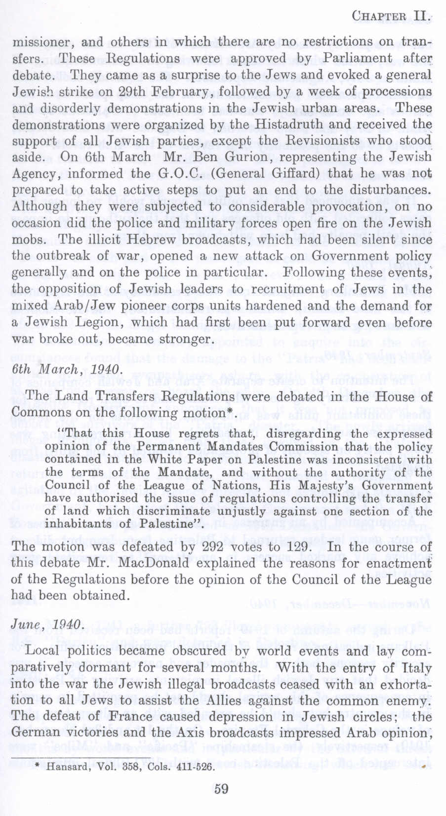 missioner, and others in which there are no restrictions on transfers. These Regulations were approved by Parliament after debate. They came as a surprise to the Jews and evoked a general Jewish strike on 29th February, followed by a week of processions and disorderly demonstrations in the Jewish urban areas. These demonstrations were organized by the Histadruth and received the support of all Jewish parties, except the Revisionists who stood aside. On 6th March Mr. Ben Gurion, representing the Jewish. Agency, informed the G.O.C. (General Giffard) that he was not prepared to take active steps to put an end to the disturbances. Although they were subjected to considerable provocation, on no occasion did the police and military forces open fire on the Jewish mobs. The illicit Hebrew broadcasts, which had been silent since the outbreak of war, opened a new attack on Government policy generally and on the police in particular. Following these events; the opposition of Jewish leaders to recruitment of Jews in the mixed Arab/Jew pioneer corps units hardened and the demand for a Jewish Legion, which had first been put forward even before war broke out, became stronger.
