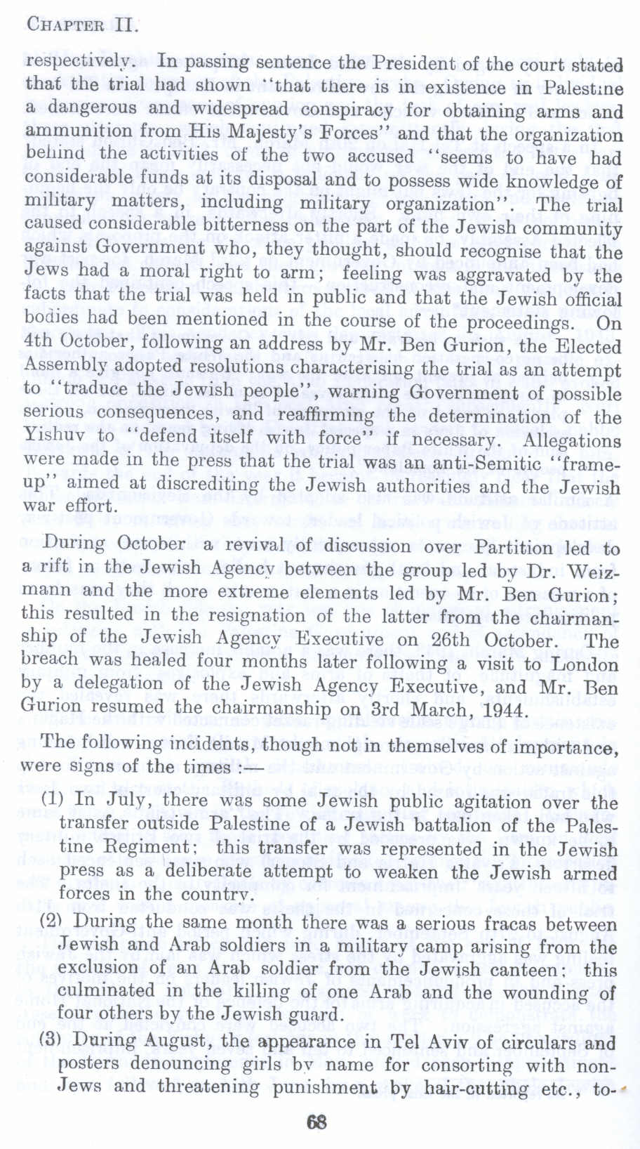 respectively. In passing sentence the President of the court stated that the trial had shown "that, there is in existence in Palestine a dangerous and widespread conspiracy for obtaining arms and ammunition from His Majesty's Forces" and that the organization behind the activities of the two accused "seems to have bad considerable funds at its disposal and to possess wide knowledge of military matters, including military organization.". The trial caused considerable bitterness on the part of the Jewish community against Government who, they thought, should recognise that the Jews had a moral right to arm; feeling was aggravated by the facts that the trial was held in public and that the Jewish official bodies had been mentioned in the course of the proceedings. On 4th October, following an address by Mr. Ben Gurion, the Elected Assembly adopted resolutions characterising the trial as an attempt to "traduce the Jewish people", warning Government of possible serious consequences, and reaffirming the determination of the Yishuv to "defend itself with force" if necessary. Allegations were made in the press that the trial was an anti-Semitic "frameup" aimed at discrediting the Jewish authorities and the Jewish war effort.