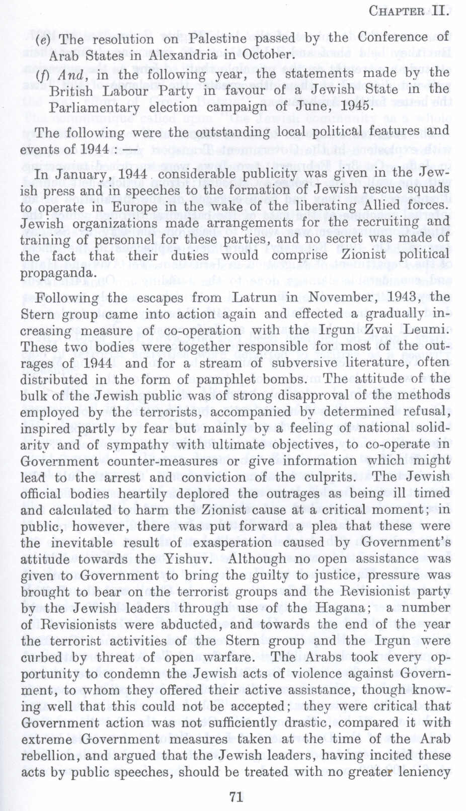 Following the escapes from Latrun in November, 1943, the Stern group came into action again and effected a gradually increasing measure of co-operation with the Irgun Zvai Leumi. These two bodies were together responsible for most of the outrages of Hl44 and for a stream of subversive literature, often distributed in the form of pamphlet bombs. The attitude of the bulk of the Jewish public was of strong disapproval of the methods employed by the terrorists, accompanied by determined refusal, inspired partly by fear but mainly by a feeling of national solidarity and of sympathy with ultimate objectives, to co-operate in Government counter-measures or give information which might lead to the arrest and conviction of the culprits. The Jewish official bodies heartily deplored the outrages as being ill timed and calculated to harm the Zionist cause at a critical moment; in public, however, there was put forward a plea that these were the inevitable result of exasperation caused by Government's attitude towards the Yishuv. Although no open assistance was given to Government to bring the guilty to justice, pressure was brought to bear on the terrorist groups and the Revisionist party by the Jewish leaders through use of the Hagana ; a number of Revisionists were abducted, and towards the end of the year the terrorist activities of the Stern group and the Irgun ~ere curbed by threat of open warfare. The Arabs took every opportunity to condemn the Jewish acts of violence against Government, to whom they offered their active assistance, though knowing well that this could not be accepted; they were critical that Government action was not sufficiently drastic, compared it with extreme Government measures taken at the time of the Arab rebellion, and argued that the Jewish leaders, having incited these acts by public speeches, should be treated with no greater leniency