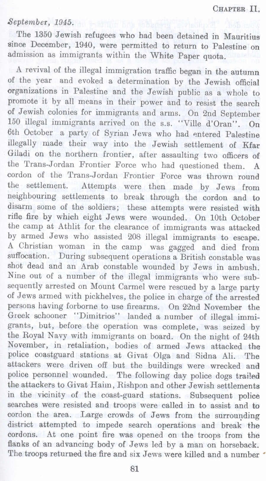 A revival of the illegal immigration traffic began in the autumn of the year and evoked a determination by the Jewish official organizations in Palestine and the Jewish public as a whole to promote it by all means in their power and to resist the search of Jewish colonies for immigrants and arms. On 2nd September 150 illegal immigrants arrived on the s.s. "Ville d'Oran". On 6th October a party of Syrian Jews who had entered Palestine illegally made their way into the Jewish settlement of Kfar Giladi on the northern frontier, after assaulting two officers of the Trans-J ordan Frontier Force who had questioned them. A cordon of the Trans-Jordan Frontier Force was thrown round the settlement. Attempts were then made by Jews from neighbouring settlements to break through the cordon and to disarm some of the soldiers; these attempts were resisted with rifle fire by which eight Jews were wounded. On 10th October the camp at Athlit for the clearance of immigrants was attacked by armed Jews who assisted 208 illegal immigrants to escape. A Christian woman in the camp was gagged and died from suffocation. During subsequent operations a British constable was shot dead and an Arab constable wounded by Jews in ambush. Nine out of a number of the illegal immigrants who were subsequently arrested on Mount Carmel were rescued by a large party of Jews armed with pickhelves, the police in charge of the arrested persons having forborne to use firearms. On 22nd November the Greek schooner "Dimitrios" landed a number of illegal immigrants, but, before the operation was complete, was seized by the Royal Navy with immigrants on board. On the night of 24th November, in retaliation, bodies of armed Jews attacked the police coastguard stations at Givat Olga and Sidna Ali. The attackers were driven off but the buildings were wrecked and police personnel wounded. The following day police dogs trailed the attackers to Givat Haim , Rishpon and other Jewish settlements in the vicinity of the coast-guard stations. Subsequent police searches were resisted and troops were called in to assist and to cordon the area. Large crowds of Jews from the surrounding district attempted to impede search operations and break the cordons. At one point fire was opened on the troops from the flanks of an advancing body of Jews led by a man on horseback. The troops returned the fire and six Jews were killed and a number