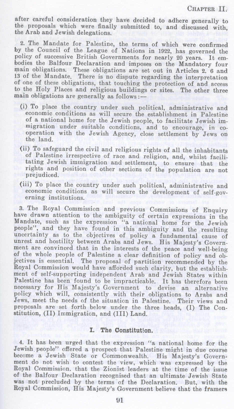 3. The Royal Commission and previous Commissions of Enquiry have drawn attention to the ambiguity of certain expressions in the Mandate, such as the expression "a national home for the Jewish people", and they have found in this ambiguity and the resulting uncertainty as to the objectives of policy a fundamental cause of unrest and hostility between Arabs and Jews. His Majesty1s Government are convinced that in the interests of the peace and well-being of the whole people of Palestine a clear definition of policy and objectives is essential. The proposal of partition recommended by the Royal Commission would have afforded such clarity, but the establishment of self-supporting independent Arab and Jewish States within Palestine has been found to be impracticable. It has therefore been necessary for His Majesty's Government to devise an alternative policy which wi11, consistently with their obligations to Arabs and Jews, meet the needs of the situation in Palestine. Their views and proposals are set forth below under the three heads, (I) The Constitution, (II) Immigration, and (III) Land.