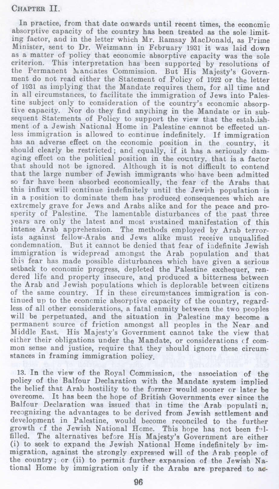 In practice, from that date onwards until recent times, the economic: absorptive capacity of the country has been treated as the sole limiting factor, and in the letter which Mr. Ramsay MacDonald, as Prime Minister, sent to Dr. Weizmann in February 1931 it was laid down as a matter of policy that economic absorptive capacity was the sole criterion. This interpretation has been supported by resolutions of the Permanent Mandates Commission. But His Majesty's Government do not read either the Statement of Policy of 1922 or the letter of 1931 as implying that the Mandate requires them, for all time and in all circumstances, to facilitate the immigration of Jews into Palestine subject only to consideration of the country's economic absorptive capacity. Nor do they find anything in the Mandate or in subsequent Statements of Policy to support the view that the establishment of a Jewish National Home in Palestine cannot be effected unless immigration is allowed to continue indefinitely. If immigration bas an adverse effect on the economic position in the country, it should clearly be restricted; and equally, if it has a seriously damaging effect on the political position in the country that is a factor that should not be ignored. Although it is not difficult to contend that the large number of Jewish immigrants who have been admitted so far have been absorbed economically, the fear of the Arabs that this influx will continue indefinitely until the Jewish population is in a position to dominate them has produced consequences which are extremely grave for Jews and Arabs alike and for the peace and prosperity of Palestine. The lamentable disturbances of the past three years ur e only the latest and most sustained manifestation of this intense Arab apprehension. The methods employed by Arab terrorists against fellow-Arabs and Jews alike must receive unqualified condemnation. But it cannot be denied that fear of indefinite Jewish immigration is widespread amongst the Arab population and that this fear has made possible disturbances which have given a serious setback to economic progress, depleted the Palestine exchequer, rendered life and property insecure, and produced a bitterness between the Arab and Jewish populations which is deplorable between citizens of the same country. If in these circumstances immigration is continued up to the economic absorptive capacity of the country, regardless of all other considerations, a fatal enmity between the two peoples will be perpetuated, and the situation in Palestine may become a permanent source of friction amongst all peoples in the Near and Middle East. His Majesty’s Government cannot take the view that either their obligations under the Mandate, or considerations of common sense and justice, require that they should ignore these circumstances in framing immigration policy.