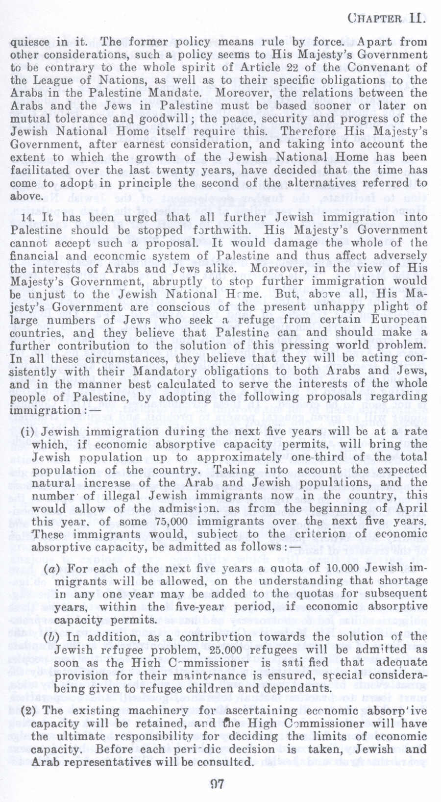 British Mandate: A Survey of Palestine: Volume I - Page 97. Annexure II: The White Paper of May, 1939. Statement of Policy. Immigration |