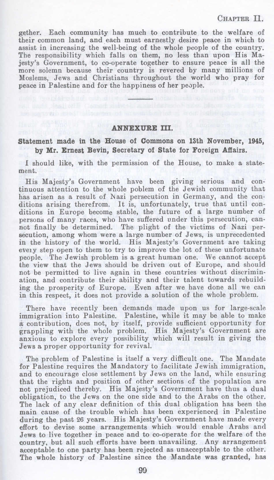 Mr. Ernest Bevin's Statement, Secretary of State for Foreign Affairs, made in the House of Commons on 13th November, 1945 on Palestine. British Mandate: A Survey of Palestine: Volume I - Page 99. Annexure III |