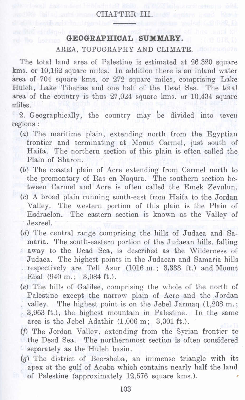 Geographic Summary of Palestine: Area, Topography and Climate, British Mandate: A Survey of Palestine: Volume I - Page 103. Chapter III. |