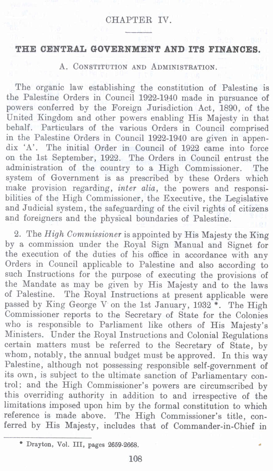 The Central Government and Its Finances: Constitution And Administration in Palestine. British Mandate: A Survey of Palestine: Volume I - Page 108. Chapter IV: |