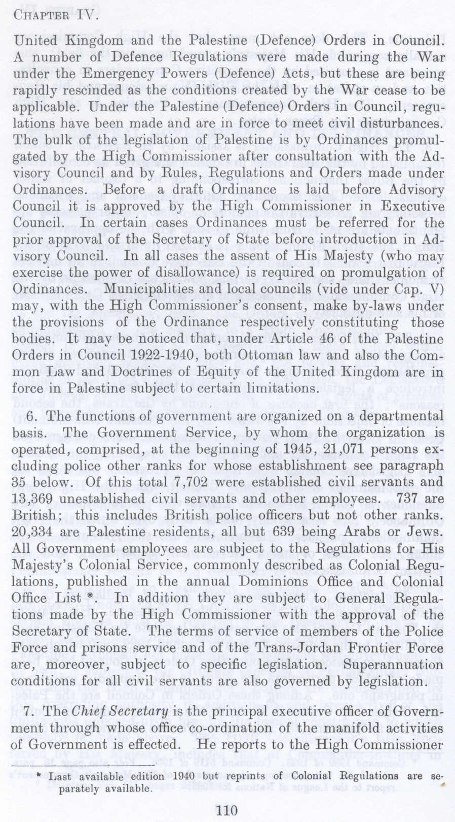 United Kingdom and the Palestine (Defence) Orders in Council. A number of Defence Regulations were made during the War under the Emergency Powers (Defence) Acts, but these are being rapidly rescinded as the conditions created by the War cease to be applicable. Under the Palestine (Defence) Orders in Council, regulations have been made and arc in force to meet civil disturbances. The bulk of the legislation of Palestine is by Ordinances promulgated by the High Commissioner after consultation with the Advisory Council and by Rules, Regulations and Orders made under Ordinances. Before a draft Ordinance is laid before Advisory Council it is approved by the High Commissioner in Executive Council. In certain cases Ordinances must be referred for the prior approval of the Secretary of State before introduction in Advisory Council. In all cases the assent of His Majesty (who may exercise the power of disallowance) is required on promulgation of Ordinances. Municipalities and local councils (vide under Cap. V) may, with the High Commissioner's consent, make by-laws under the provisions of the Ordinance respectively constituting those bodies. It may be noticed that, under Article 46 of the Palestine Orders in Council 1922-1940, both Ottoman law and also the Common Law and Doctrines of Equity of the United Kingdom are in force in Palestine subject to certain limitations.