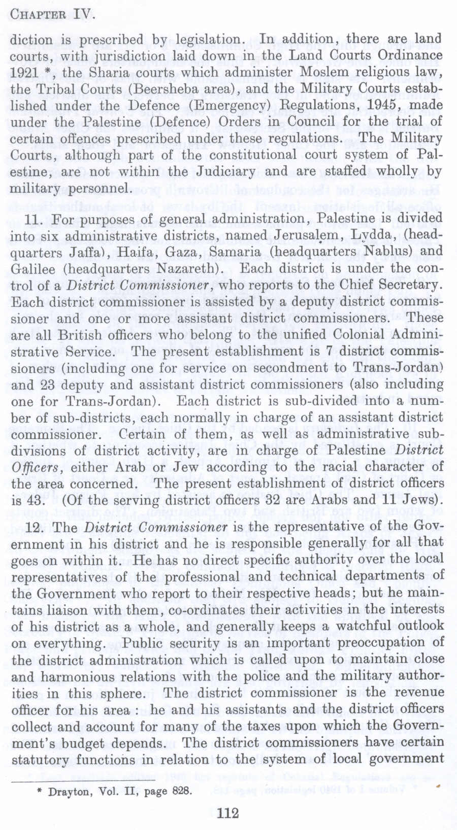 11. For purposes of general administration, Palestine is divided into six administrative districts, named Jerusalem, Lvdda, (headquarters Jaffa), Haifa, Gaza, Samaria (headquarters Nablus) and Galilee (headquarters Nazareth). Each district is under the control of a District Commissioner, who reports to the Chief Secretary. Each district commissioner is assisted by a deputy district commissioner and one or more assistant district commissioners. These are all British officers who belong to the unified Colonial Administrative Service. The present establishment is 7 district commissioners (including one for service on secondment to Trans-Jordan) and 23 deputy and assistant district commissioners (also including one for Trans-Jordan). Each district is sub-divided into a number of sub-districts, each normally in charge of an assistant district commissioner. Certain of them, as well as administrative subdivisions of district activity, are in charge of Palestine District Officers, either Arab or Jew according to the racial character of the area concerned. The present establishment of district officers is 43. (Of the serving district officers 32 are Arabs and 11 Jews).