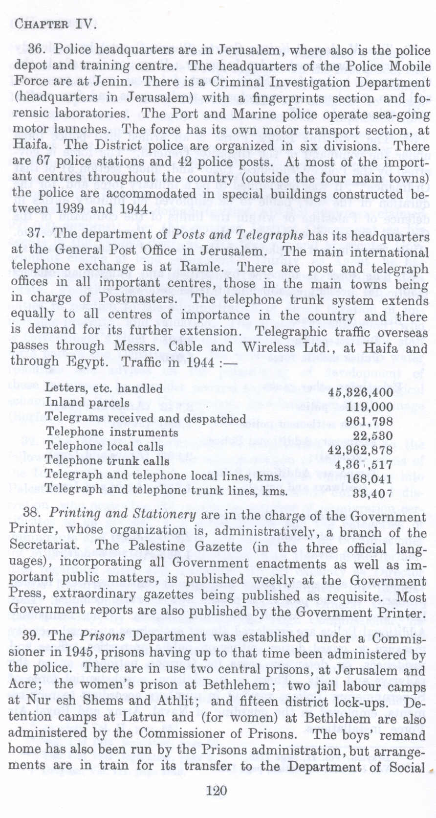 37. The department of Posts and Telegraphs has its headquarters at the General Post Office in Jerusalem. The main international telephone exchange is at Ramie. There are post and telegraph offices in all important centres, those in the main towns being in charge of Postmasters. The telephone trunk system extends equally to all centres of importance in the country and there is demand for its further extension. Telegraphic traffic overseas passes through Messrs. Cable and Wireless Ltd., at Haifa and through Egypt. Traffic in 1944