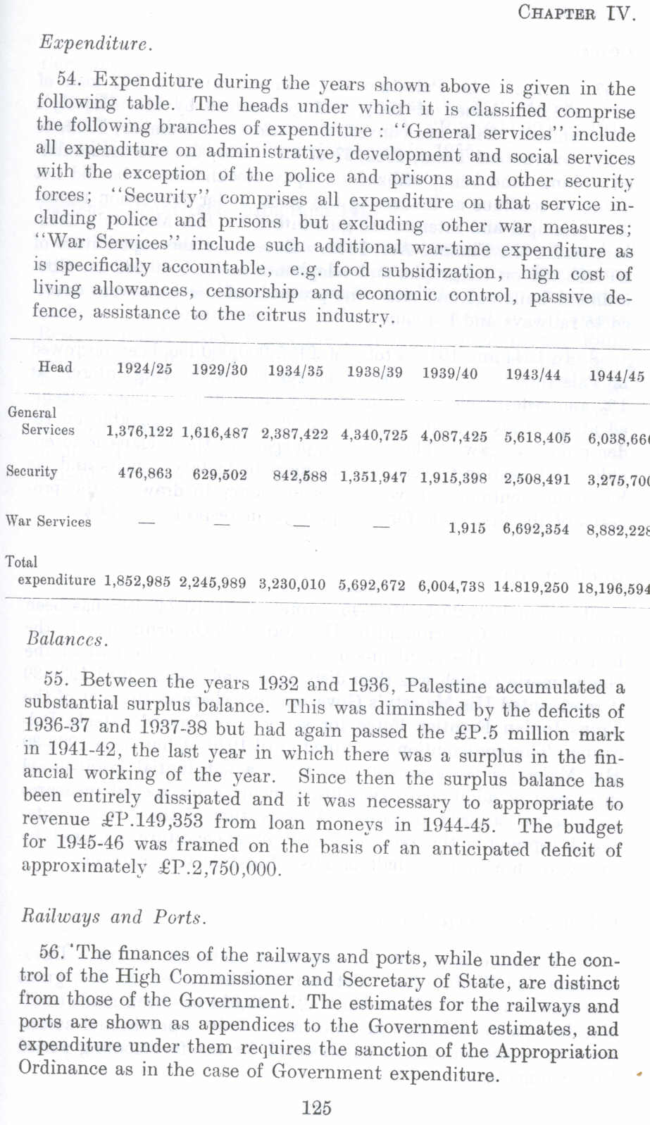 Government Expenditure, Balances, Railways and Ports in Palestine. British Mandate: A Survey of Palestine: Volume I - Page 125. Chapter IV: The Central Government and Its Finances:Government Finances. |
