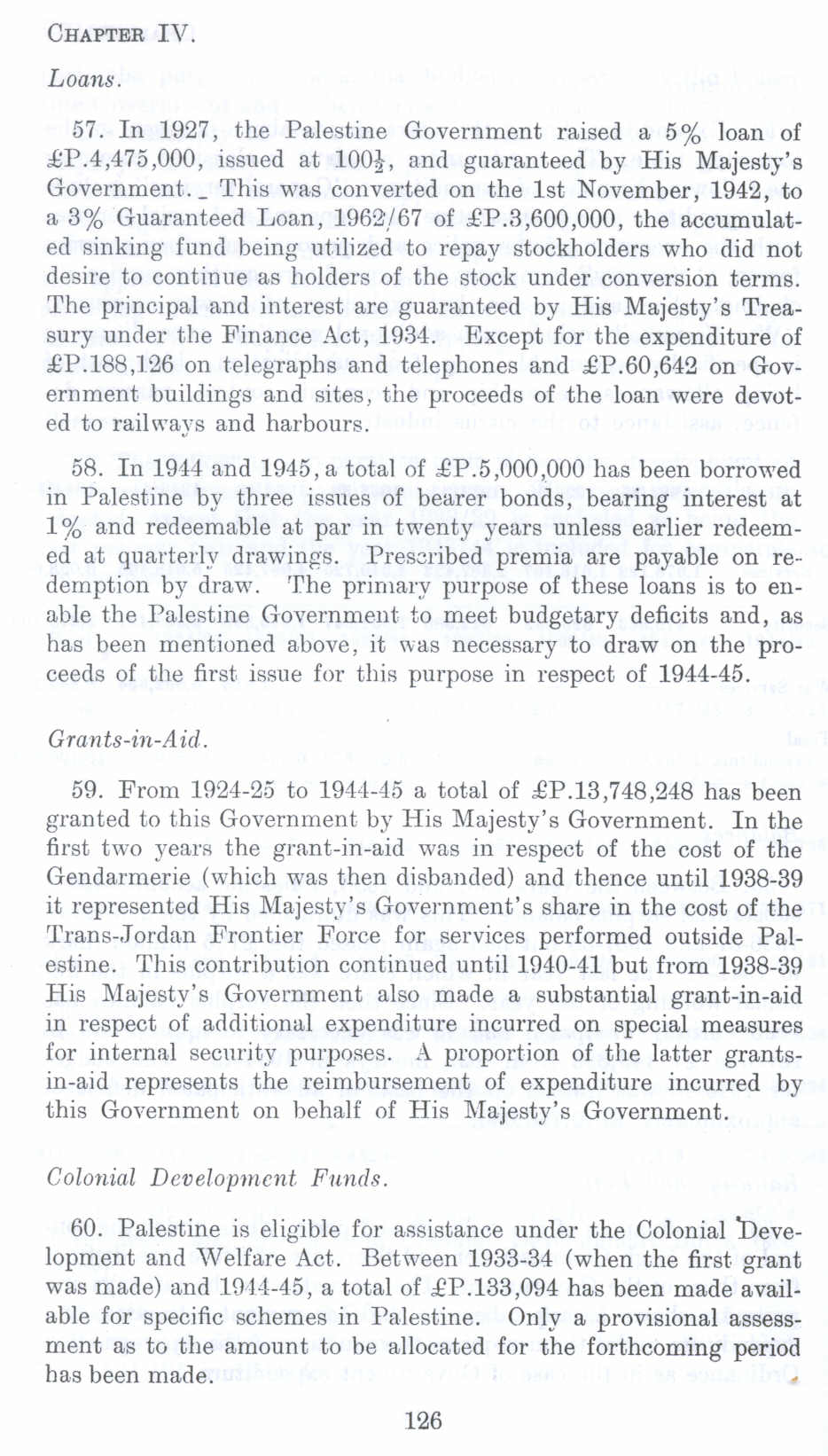 Government Finances: Loans, Grants-in-Aid, Colonial Development Fund in Palestine. British Mandate: A Survey of Palestine: Volume I - Page 126. Chapter IV: The Central Government and Its Finances |