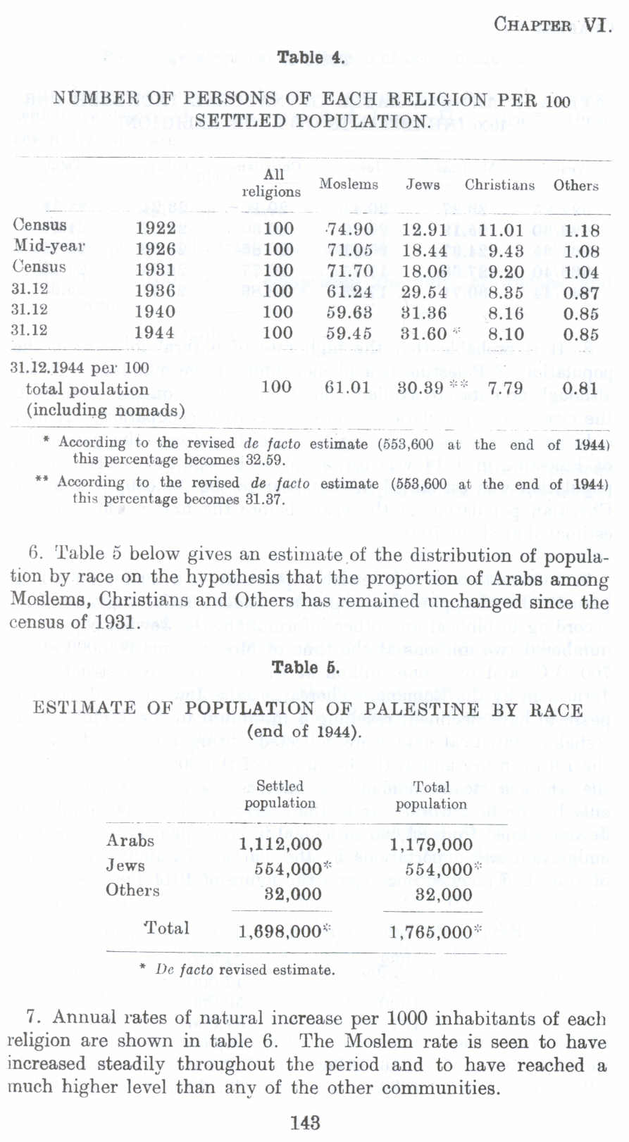 Table 4: Number of Persons of Each Religion Per 100 Settled Population in Palestine, and Table 5: Estimate of Population of Palestine By Race (end of. 1944). British Mandate: A Survey of Palestine: Volume I - Page 143. Chapter VI |