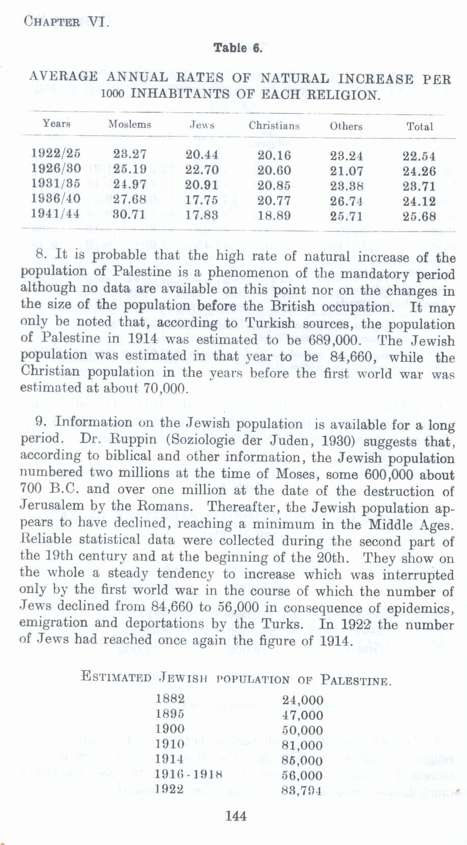 Average annual Rates of Natural Increase Per 1000 Inhabitants of Each Religion in Palestine before 1948 (Nakba). British Mandate: A Survey of Palestine: Volume I - Page 144. Chapter VI: Population: |