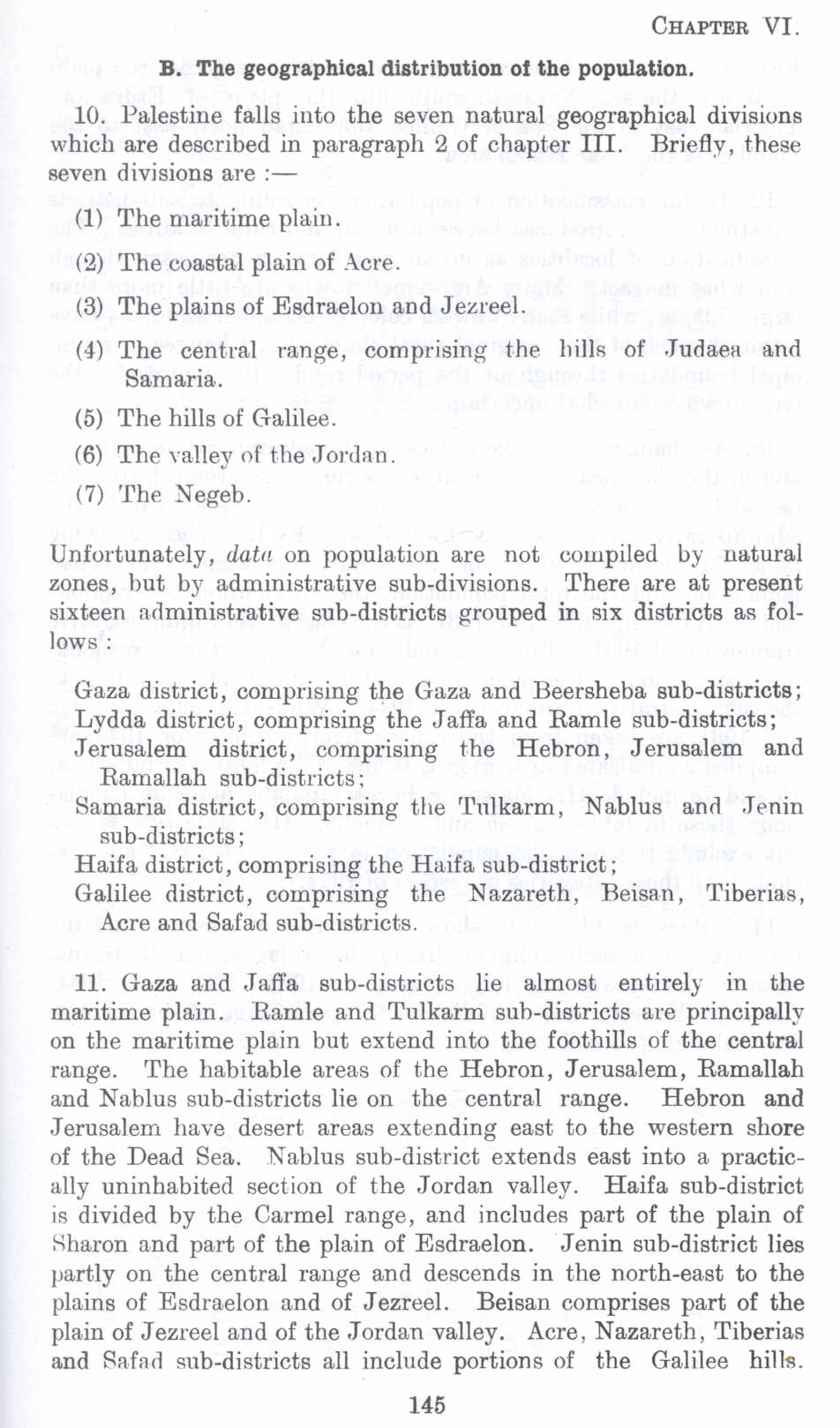 10. Palestine falls into the seven natural geographical divisions which are described in paragraph 2 of chapter ill. Briefly, these seven divisions are :-