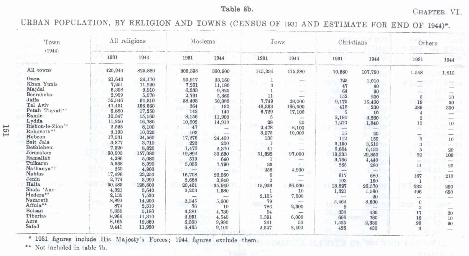 Urban Population By Religion and Towns (Census of 1931 and estimates of 1944*) in Palestine before Nakba. British Mandate: A Survey of Palestine: Volume I - Page 151. Chapter VI: Population: B. Geographical Distribution of the Population: |